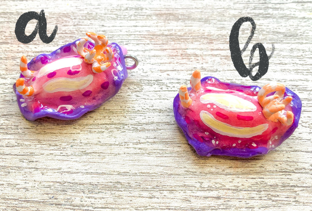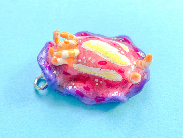 Charm (pequeño accesorio que se coloca en un collar o pulsera) de la especie "Mexichromis aurora" hecho con arcilla polimérica y recubierta de resina epoxi UV. Tiene una argolla para poder usarse de colgante/llavero/pulsera con un diámetro de ~4 mm. No incluye colgante. Pieza única.